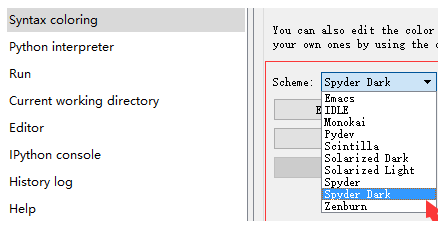 2.然后在Scheme下拉菜单中选择Spyder Dark模式即可