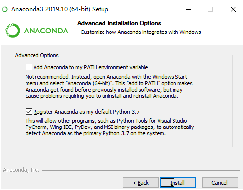 来到 Advanced Options. 第一个是加入环境变量,第二个是默认使用 Python 3.7,直接按照默认的,也可自己修改,点击“Install”。