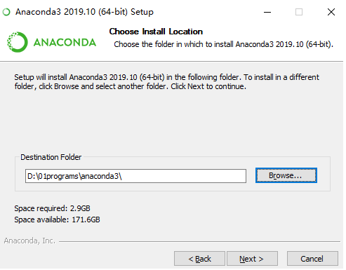 Destination Folder 是“目标文件夹”的意思,可以选择安装到什么地方。默认是安装到 C:\Users\username\Anaconda3 文件夹下(username是你的 Windows 用户名)。你也可以选择 Browse... ,选择想要安装的文件夹。
