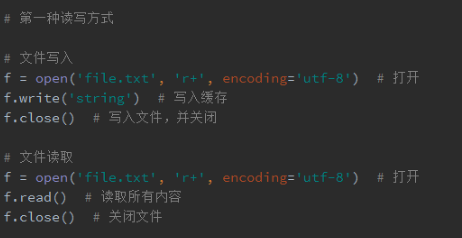 f.seek(offset, whence) # 设置文件当前光标(指针)的位置。f.seek(0,0) 把光标设置在文件开。offset:偏移量(字节数);whence:可选,默认值为 0。0代表从文件开头开始算起,1代表从当前位置开始算起,2代表从文件末尾算起文件读写实例: 方式1、打开用内置函数open(),参数有很多重点了解常用的三个 open(file, mode='r', encoding=None)