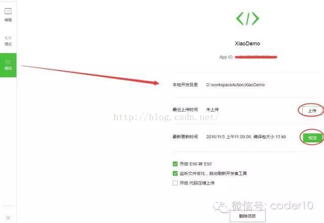 创建完成之后,就可以上传代码了;在开发工具中,有“上传”按钮,点击上传,即可将本地代码上传到微信平台的 开发管理 中。